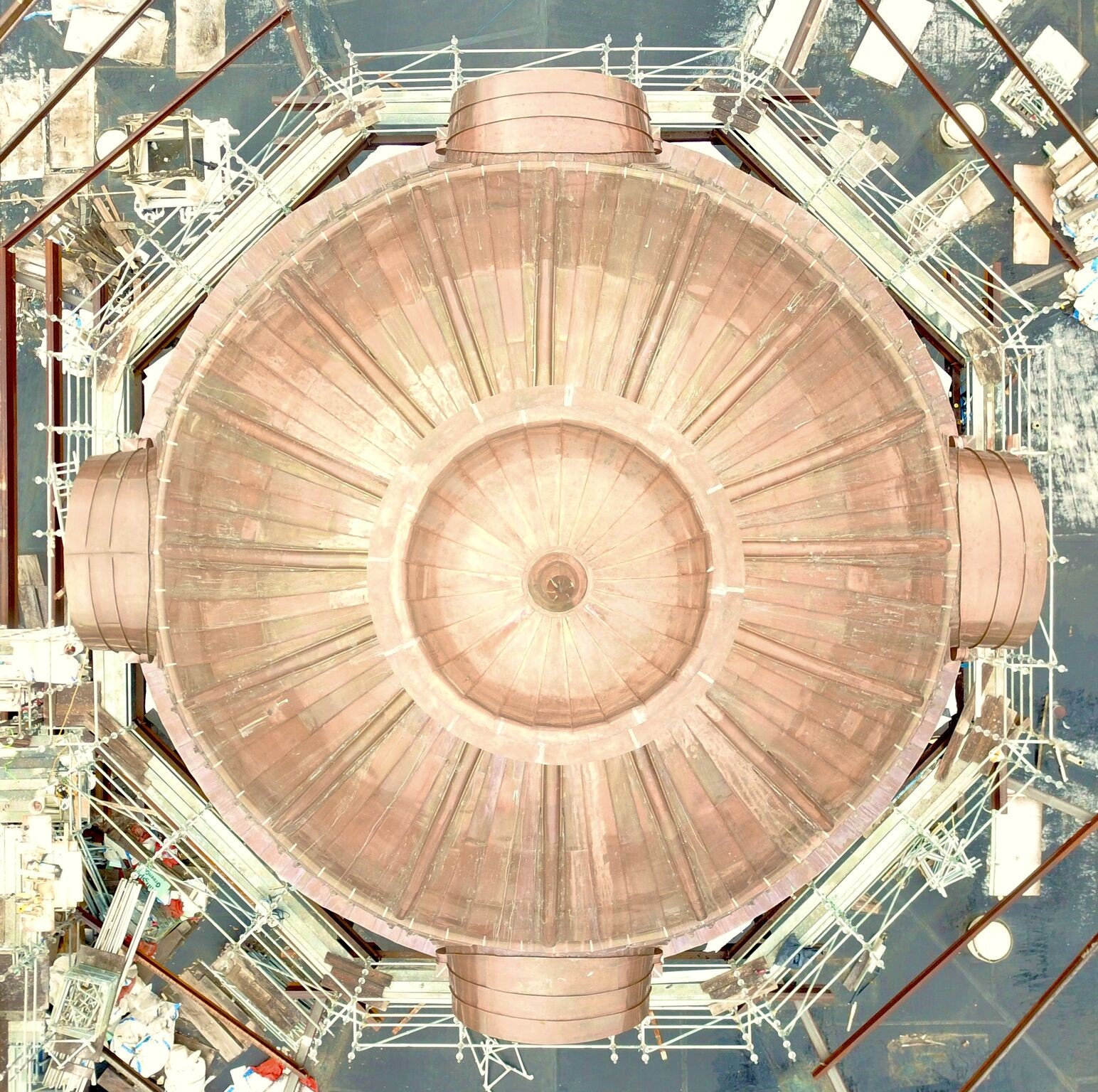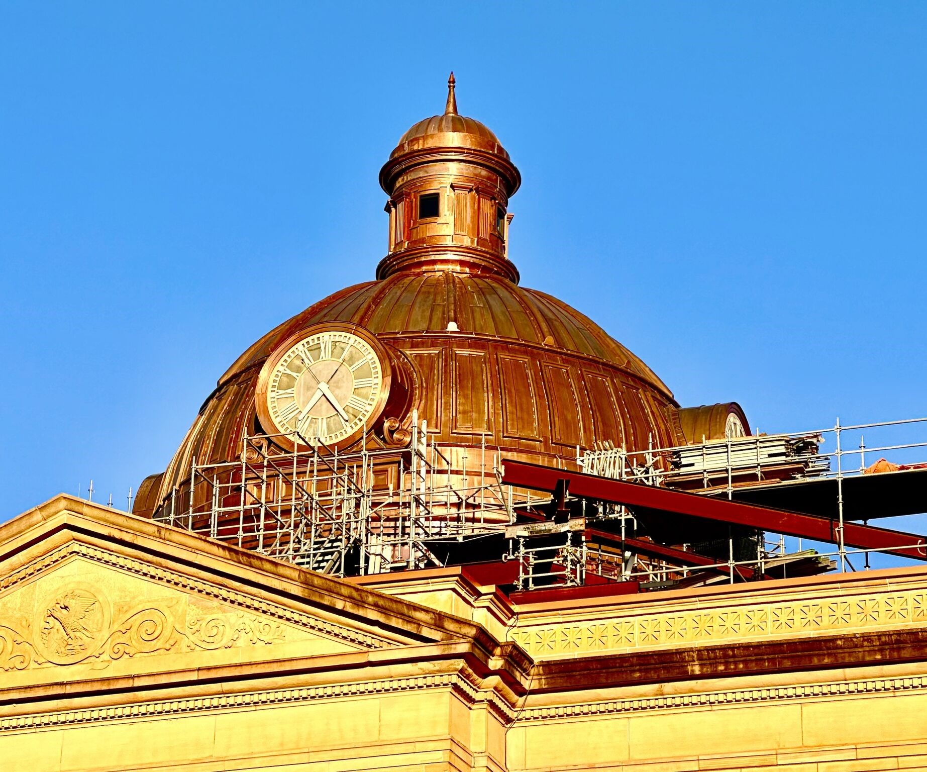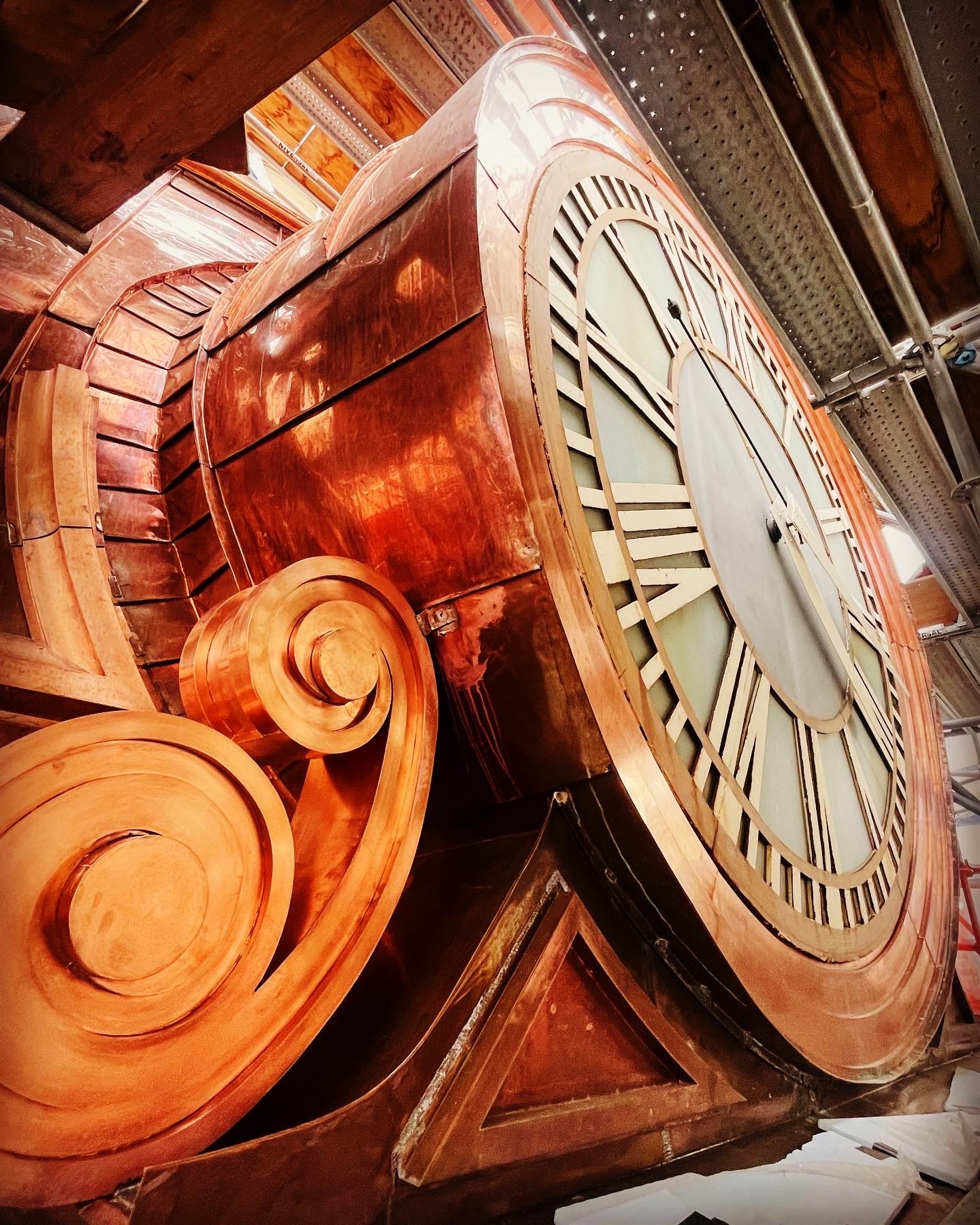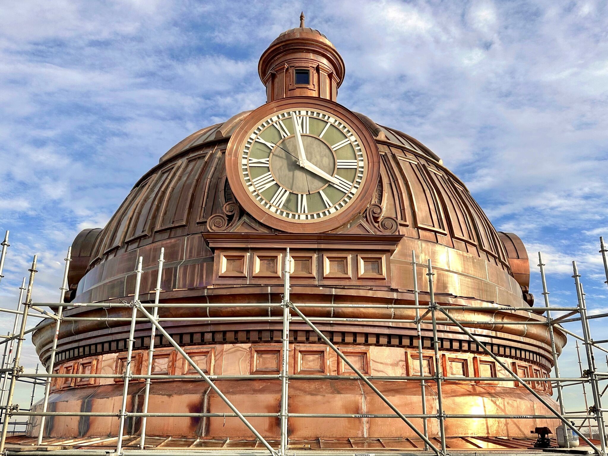 Work on the Logan County Courthouse – built in Lincoln, Ill., during the 1890s – included the comprehensive restoration of the dome structure, as well as work on associated decorative elements such as the oversized, highly ornamented, copper-clad clocks. Durable Restoration completed the installation, with multiple ornamental elements as well as radius cornice work fabricated off site by Heather & Little, and Chicago Metal Supply (another firm completed restoration of the cupola atop the dome). Using 20-ounce copper that matched the original material, the team devised and installed a complex system of double-lock folded copper sections with pleated valleys to accommodate thermal movement and alleviate associated stresses. This new design recreated the dome’s original aesthetics while providing a durable, functional solution.