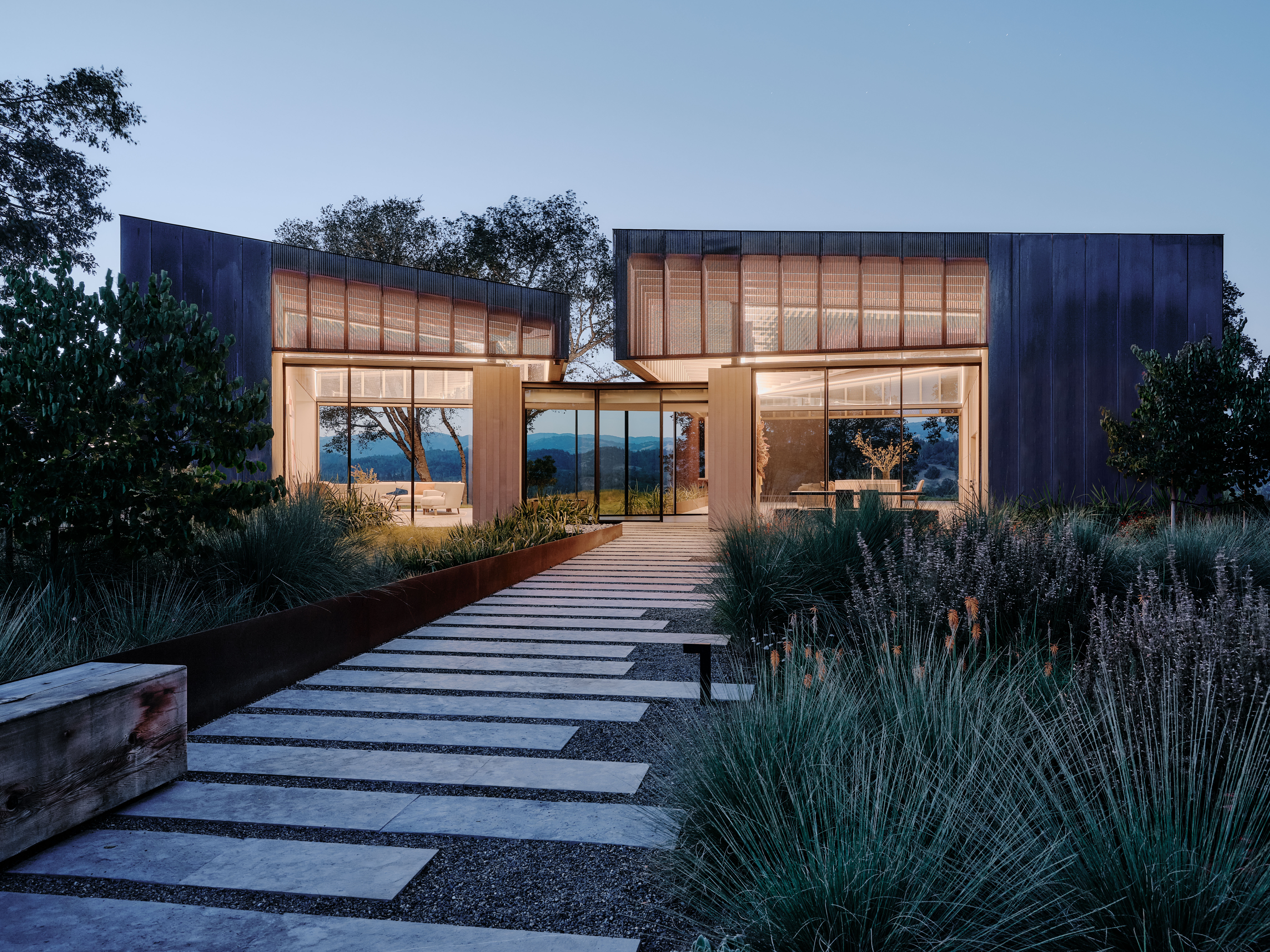 The Madrone Ridge residence nestles into a promontory overlooking Sonoma County. Inspired by its natural surroundings, the design caters to a young family with a strong connection to the site. The team paid rigorous attention to detail while designing three pavilions covered in copper cladding to improve resilience, reduce maintenance, and establish a visual relationship to the surrounding Madrone trees. Breezeways among the pavilions link the three volumes while maintaining a connection with the outdoors.