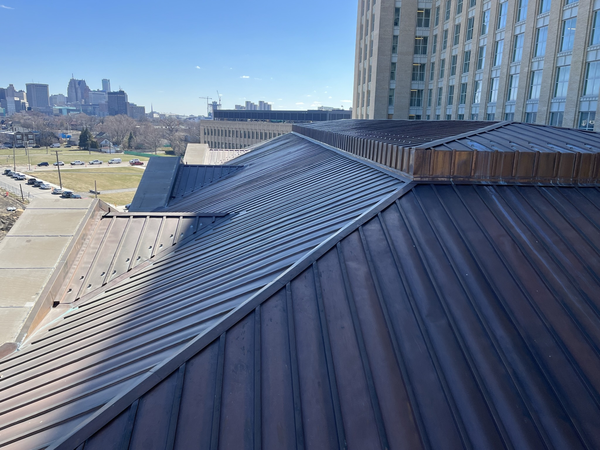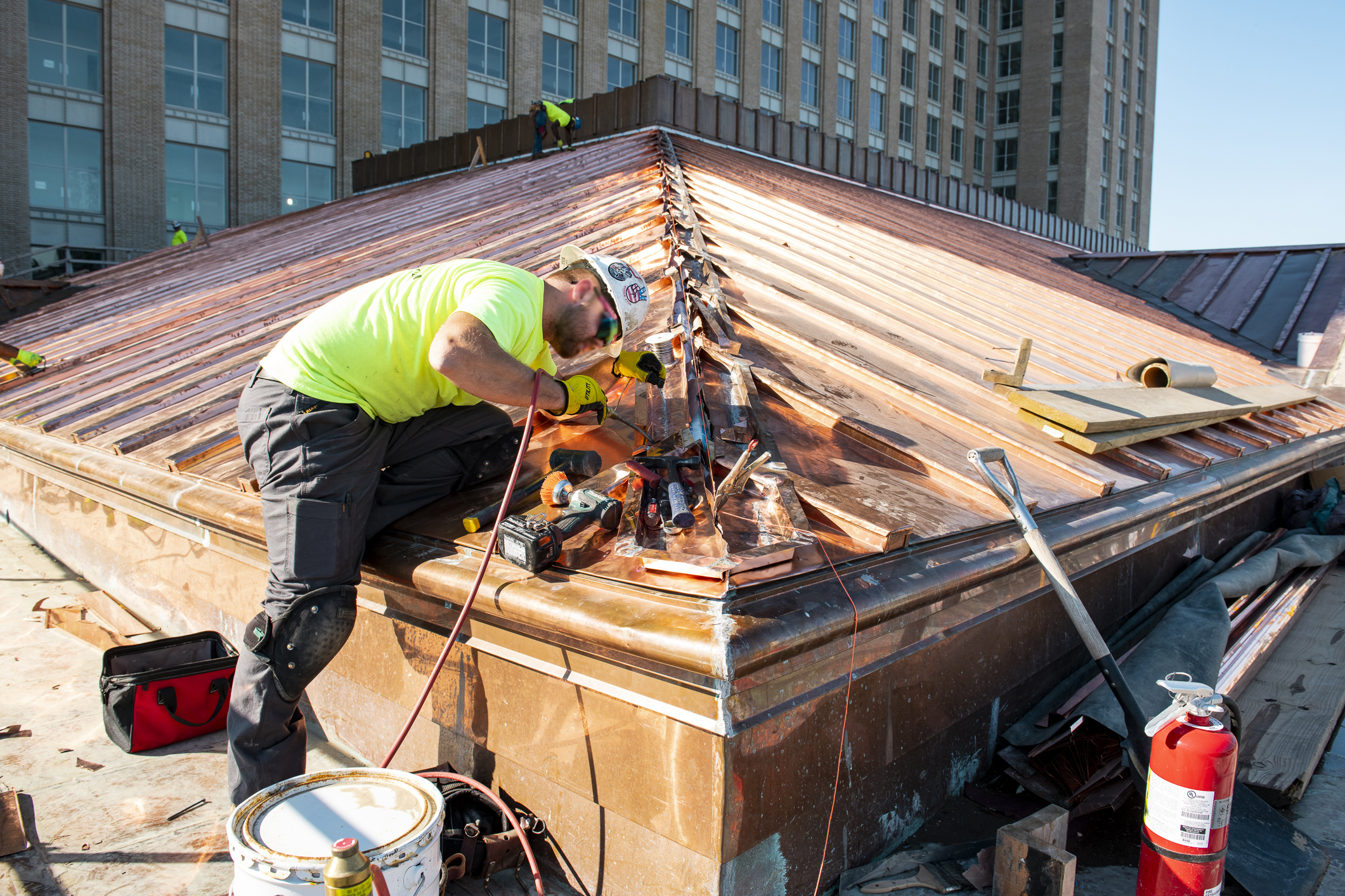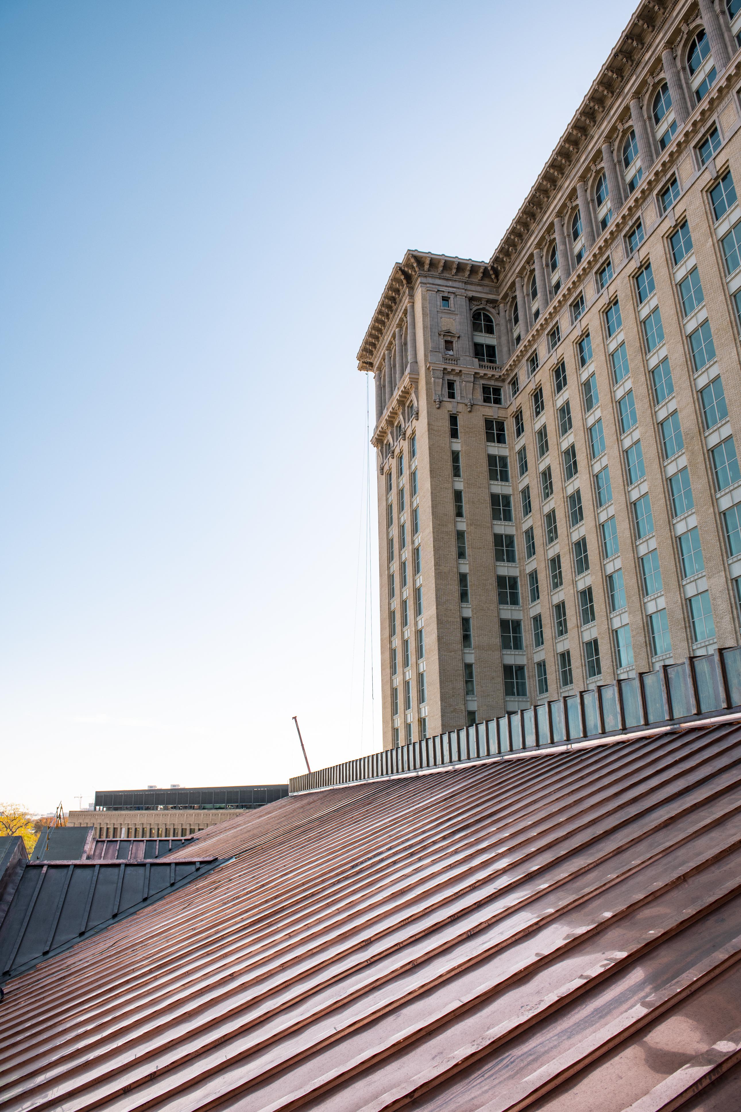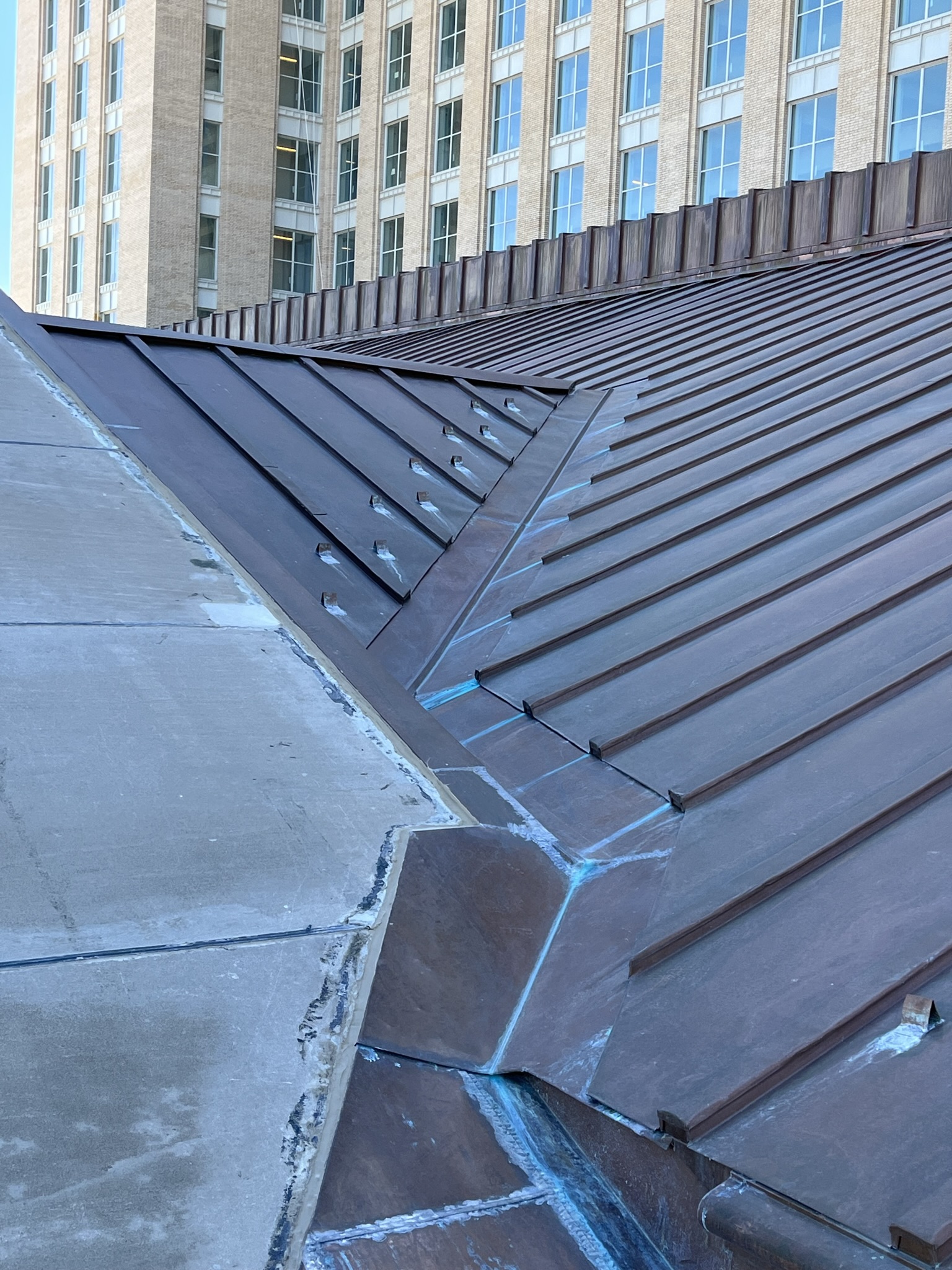 As a key partner of the exterior restoration, expert craftsmen from CASS Sheet Metal recreated a historically accurate copper batten-seam roof and improved the building’s valley, gutter and drainage systems. Special attention and intense coordination with the Quinn Evans architectural team helped to solve issues with weathertightness and thermal movement that had affected the building prior to this project.