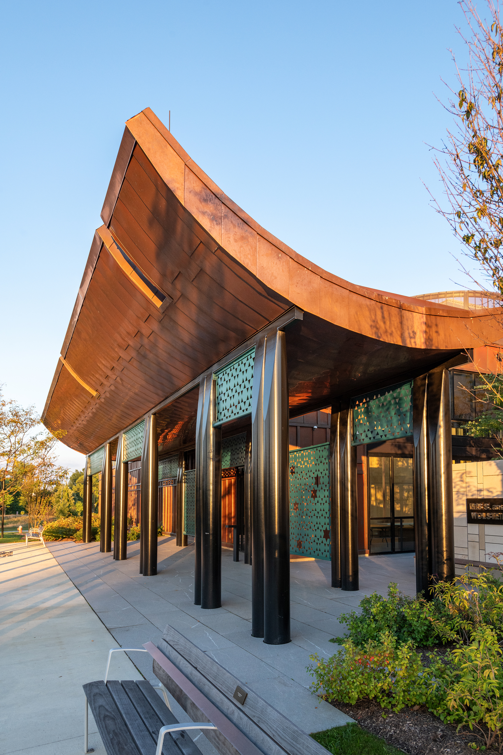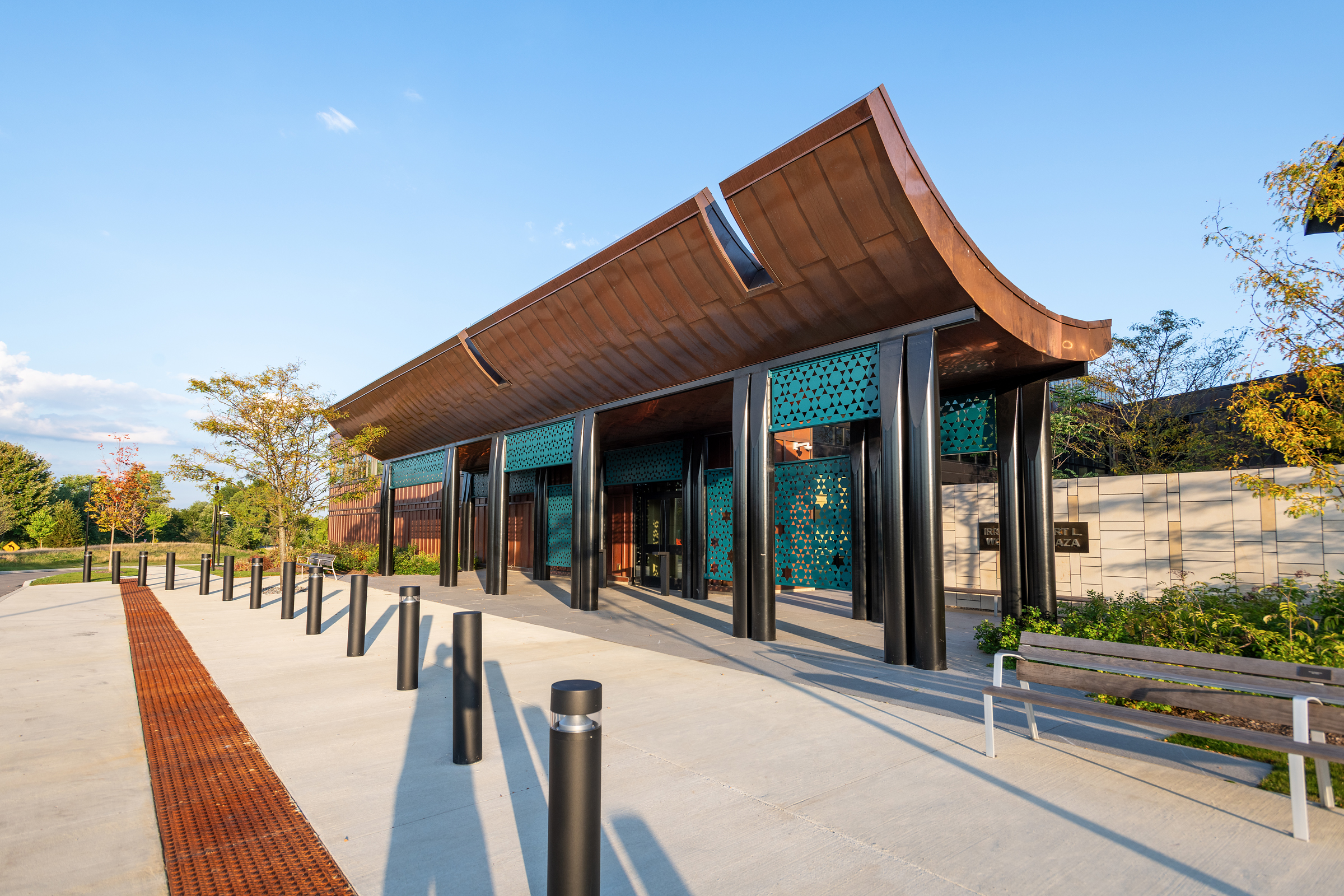 The Park Synagogue expansion project enhances the overall campus by enlarging the sanctuary while also adding a chapel, a reception area, and restrooms, along with additional gathering spaces for services and celebrations in a new family community hall. A new veranda outside the hall permits services and events to take place year-round. Installation of the project elements required precise detail and careful coordination among the design team, construction manager, façade contractor, fabricators, and field installers.
